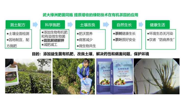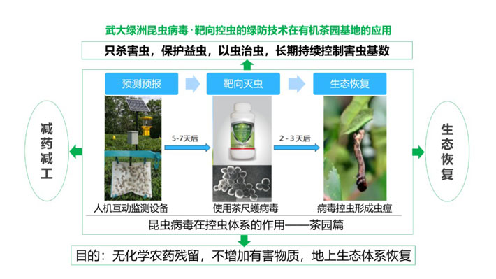 作為綠色防控首創(chuàng)者,武大綠洲擁有多項(xiàng)應(yīng)用于茶領(lǐng)域的綠色防控技術(shù),可以解決茶產(chǎn)業(yè)農(nóng)殘超標(biāo)、茶品質(zhì)不高、茶產(chǎn)量低、茶園生態(tài)被破壞等突出問(wèn)題,使用武大綠洲全套技術(shù)產(chǎn)出茶葉能達(dá)到國(guó)內(nèi)有機(jī)、歐盟有機(jī)標(biāo)準(zhǔn)。武大綠洲成立了“綠色防控產(chǎn)業(yè)發(fā)展研究院”(陳宗懋院士為聯(lián)合發(fā)起人、首位入駐院士),在廣西將軍峰、雷電山、杭州抹茶、湖北浠水以及武漢龍壹茶場(chǎng)等進(jìn)行茶葉綠色防控示范。