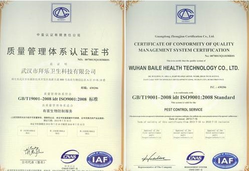 武漢市拜樂衛(wèi)生科技有限公司順利通過ISO9001:2008質(zhì)量管理體系認(rèn)證,標(biāo)志著其有害生物防制服務(wù)質(zhì)量和管理水平已達(dá)國(guó)際權(quán)威標(biāo)準(zhǔn)。